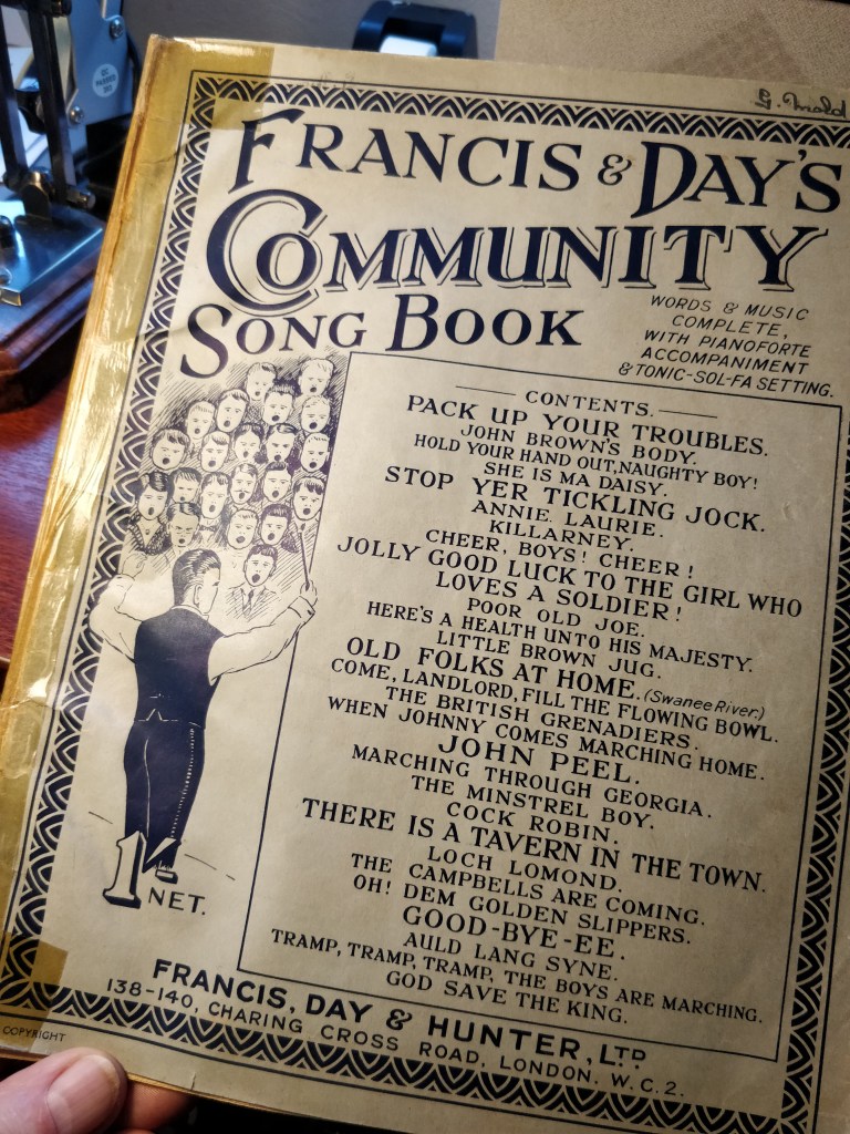 Words and music complete with Pianoforte Accompaniment & Tonic-Sol-Fa Setting 52 page (A4’ish) with tape repairs to cover but complete. Songs include; Pack up your Troubles, John Brown’s Body, Stop Your Tickling Jock, John Peel, There’s a Tavern in the Town, Auld Lang Syne and many more. Price includes UK postage – contact me for other rates.